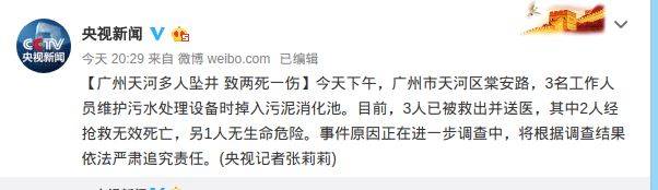 10日下午,广州市天河区棠安路,3名工作人员维护污水处理设备时掉入污泥消化池。据@央视新闻最新消息,目前,3人已被救出并送医,其中2人经抢救无效死亡。